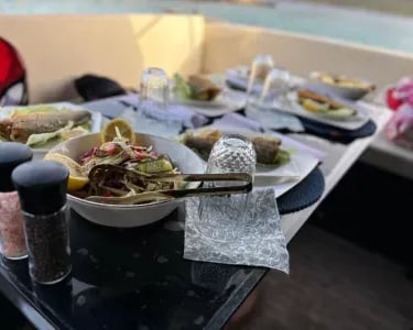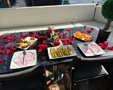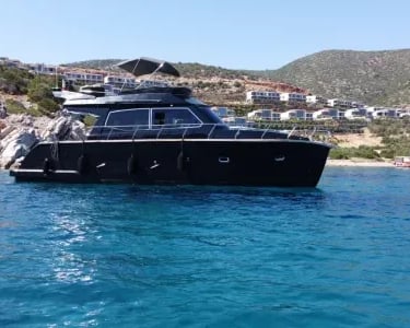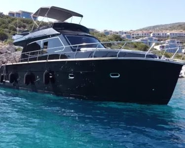 Our Black Yacht departing from Bodrum serves you with special privileges with our experienced and friendly team in special celebrations such as daily tours and sunset tours, birthdays, marriage proposals. Our 15-meter fiber motor yacht will accompany you, our valued customers, on your Bodrum journey with its ultra-luxury design and home comfort quality. Our luxury motor yacht, which has toilets and dressing rooms where you can meet your needs, is suitable for small groups. Our guests can use the cabins to rest if they wish. Our yacht has a music system where you can listen to the music you want. Our motor yacht, which has water sports opportunities, will continue to serve you all day long in the most unique bays of Bodrum. You can benefit from our diving equipment and experience the opportunity to swim with the magnificent creatures of the Bodrum sea. You can have pleasant moments and gain different experiences with fishing tackle. You can obtain beach towels specially prepared for you according to your needs. Our guests who are tired of the blue cruise can ask for stomach-soothing pills and first aid materials from our experienced team, if necessary. You can continue your Bodrum Boat Tour comfortably on our very soft cushions where you can relax and enjoy the sun all day long. Do not forget to make a reservation to taste the delicious treats prepared with carefully selected ingredients on our luxurious Black Yacht and go on a pleasant journey.